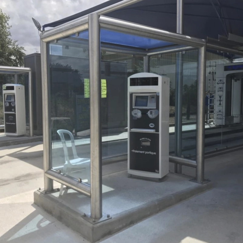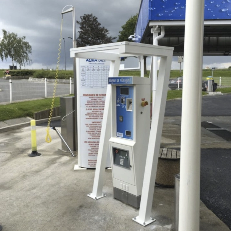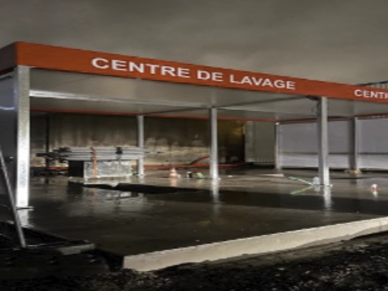 Cette réalisation illustre la polyvalence de nos structures en inox, adaptées non seulement aux stations de lavage auto, mais aussi aux laveries automatiques, kiosques ou espaces techniques.