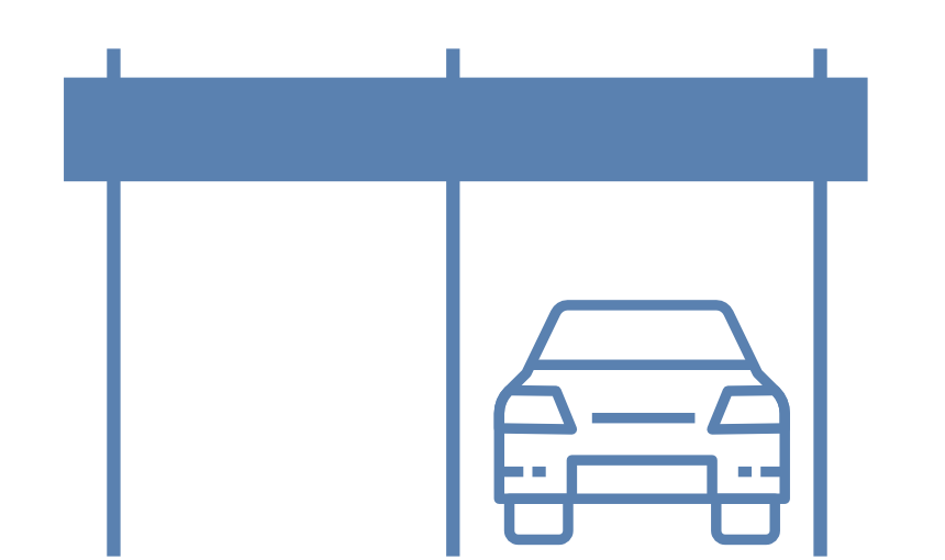 Structure en acier avec poteaux verticaux, couverture en tôle et bandeau de 500 mm.