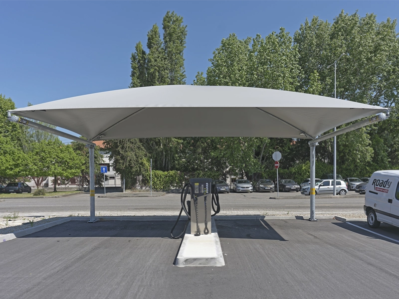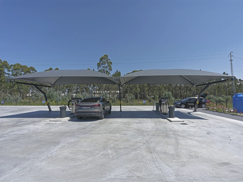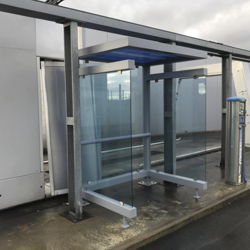 Structure en tube galvanisé 100×100 mm peint à la couleur demandée, toiture en panneau sandwich, design harmonieux avec l’environnement.